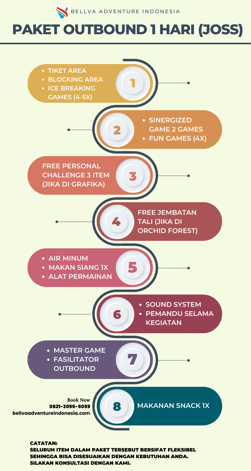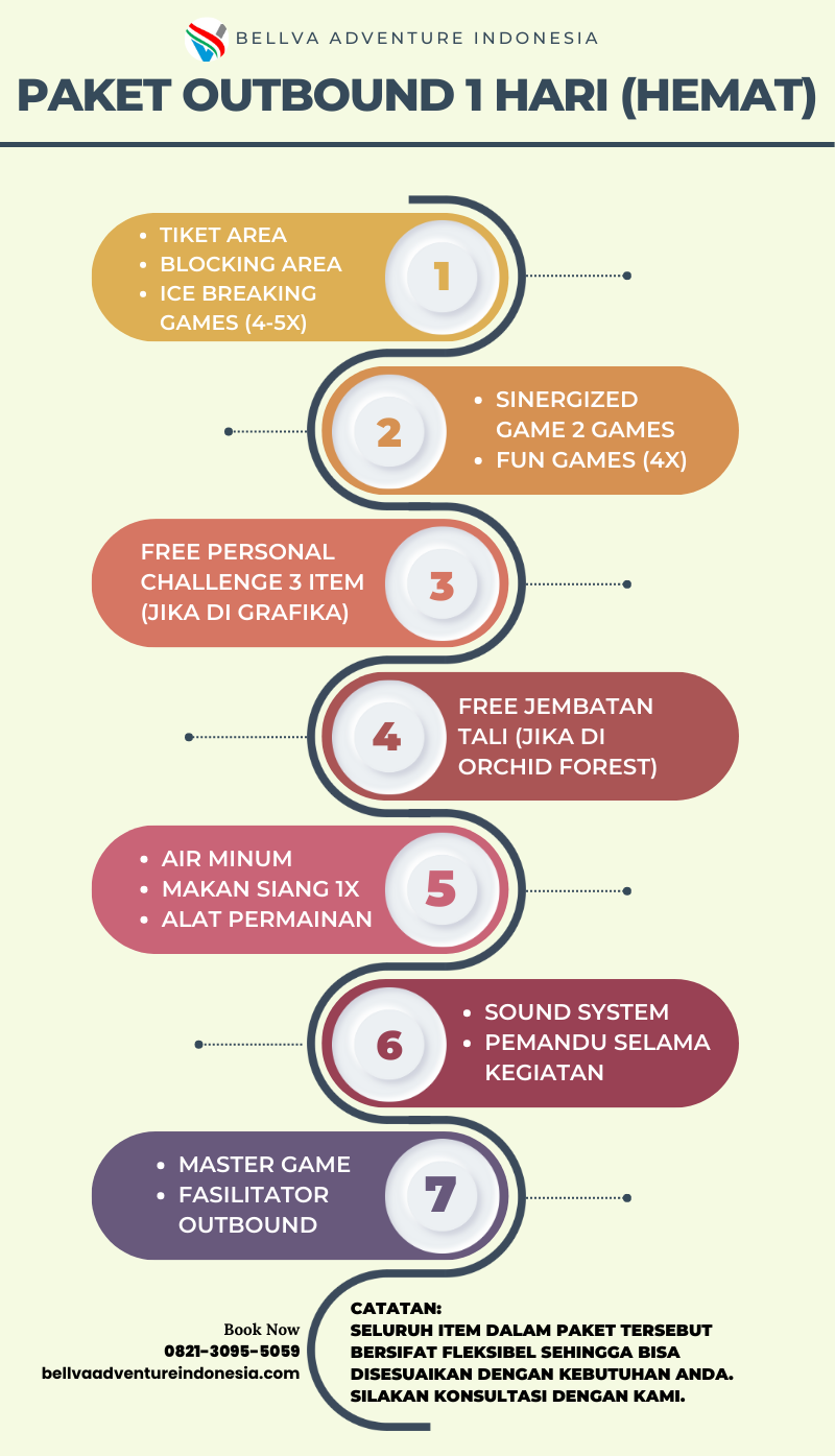 Di dalam paket outbound Bandung 1 hari terdapat kegiatan outbound, fun game dan team building. Paket ini merupakan paket kegiatan untuk membangun kebersamaan yang akan dipandu oleh master game dan fasilitator/pendamping.